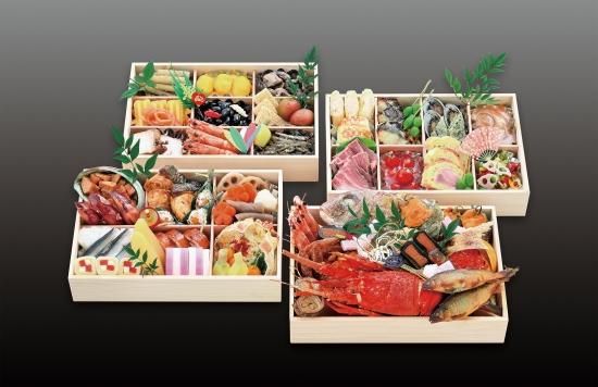 ロブスター、鯛の塩焼き、さざえウニ焼き、あわびのウニ和え、ブリ照焼き、ママカリ酢漬け、数の子、フカヒレ姿煮、とこぶし、ローストビーフ、有頭海老の艶煮、田作り、煮しめ、紅白かまぼこ、栗きんとんなど