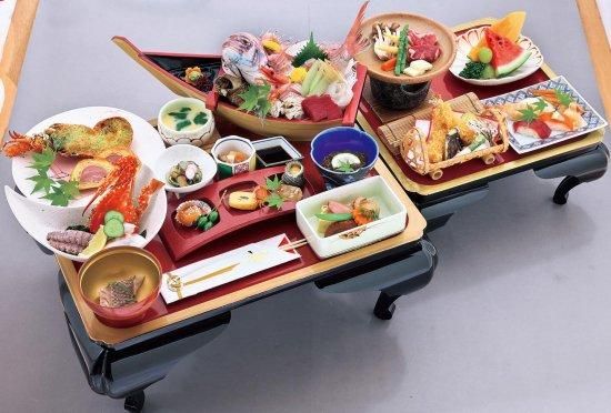 前菜、旬のお造り(船盛)、煮物、焚合せ、茶碗蒸し、酢の物、鯛の吸物、肉料理、天ぷら、にぎり寿司、茶碗蒸し、寿司、フルーツなど